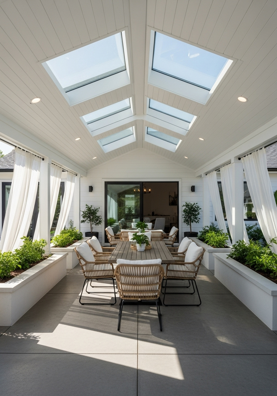 Solve the challenge of wanting both coverage and natural light with a covered back patio attached to your house that incorporates skylights. Large glass panels set into a white-paneled roof flood the space with natural light while protecting you from rain and direct sun. The result feels open and airy despite being fully covered.
