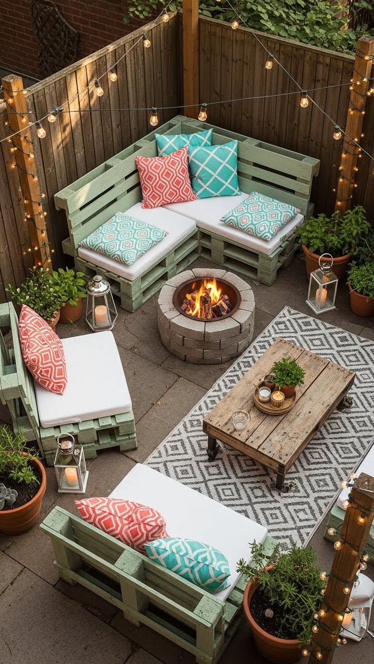 Turn salvaged wooden pallets into charming outdoor furniture for your small backyard patio. Sand down the wood, paint it in soft colors like sage green or white, and add vibrant cushions in coral and turquoise geometric patterns. A small fire pit made from stacked concrete blocks becomes your centerpiece, while string lights wrapped around fence posts create that perfect evening glow. This DIY approach to backyard patio designs for small spaces costs a fraction of store-bought furniture and adds unique character to your outdoor area.