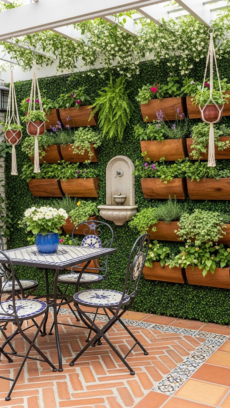 Place a compact bistro set with wrought iron chairs and a mosaic tile table on herringbone brick pavers beneath a white pergola draped with climbing jasmine vines. Add a small wall-mounted fountain for soothing water sounds, and hang macrame planters at different heights to maximize the vertical dimension. Solar-powered wall sconces provide evening ambiance while highlighting your green wall masterpiece. The layout for small yard patios like this proves that 10×12 feet can feel like a private botanical garden retreat when you think vertically.