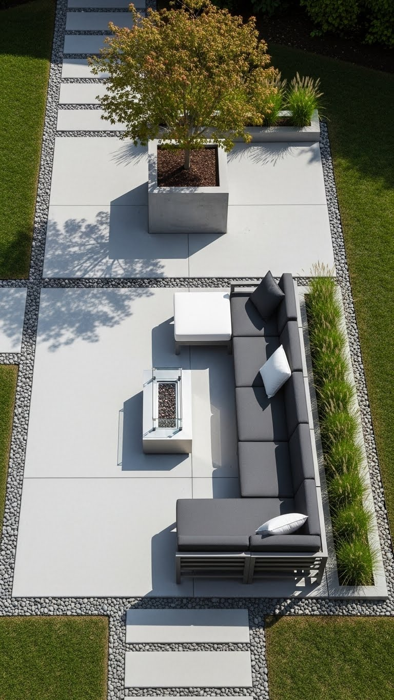 River rock borders separate the patio from your lawn with natural definition, while three concrete stepping stones create a subtle entrance path. Add ornamental grasses in linear planters along the edges and position a sleek metal fire table with glass surround as your centerpiece. The minimalist approach with pops of green makes your backyard patio design for small spaces feel larger and more serene. This layout for small yard patios demonstrates how restraint in color and form can create maximum impact and a peaceful atmosphere perfect for meditation or quiet conversation.