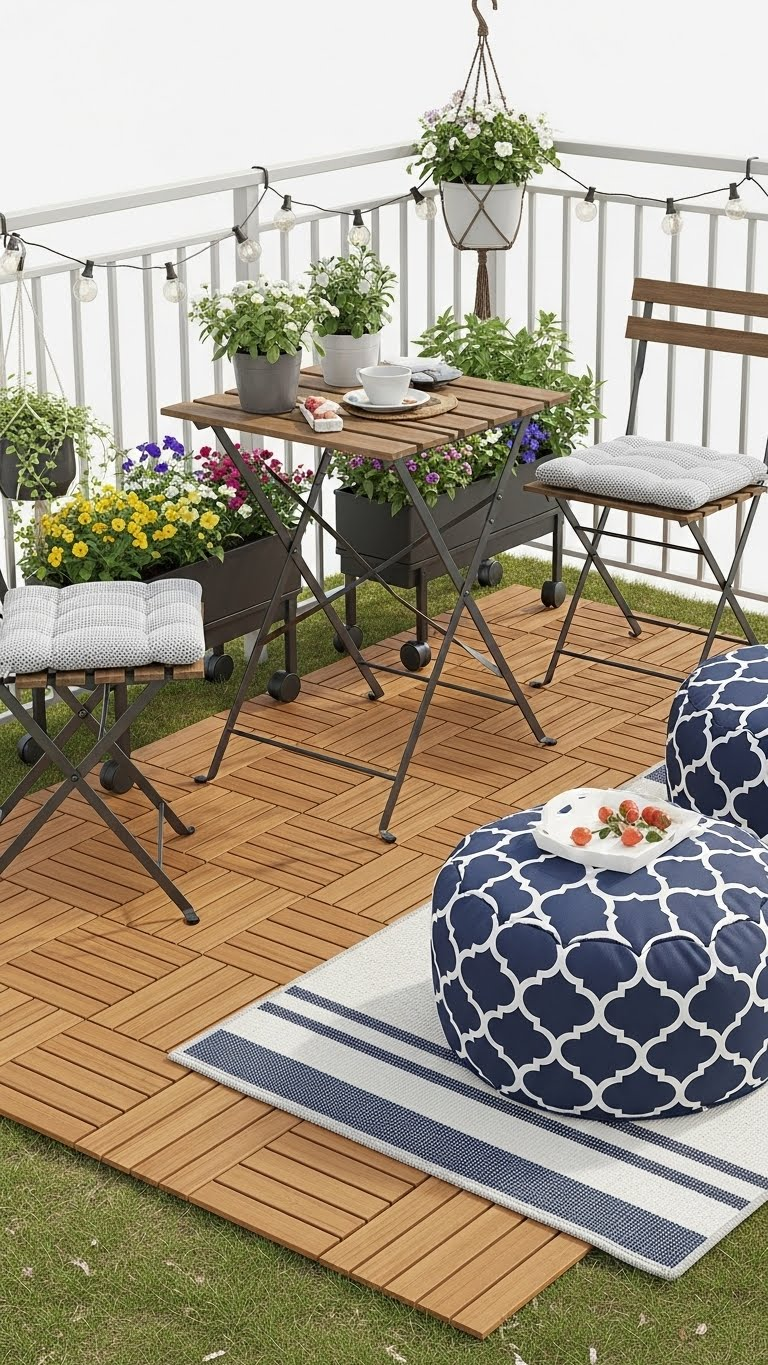 Pair your temporary flooring with lightweight folding bistro furniture in matte black metal that stores easily in a closet or garage during off-season. Put your planters on wheels so you can rearrange your small backyard patio design whenever inspiration strikes, and use removable adhesive hooks for string lights and hanging plants. Add outdoor poufs in weather-resistant fabric with Moroccan trellis patterns and a foldable outdoor rug in navy and white stripes. This budget DIY approach to backyard patio designs for small spaces gives renters all the style without any of the commitment.