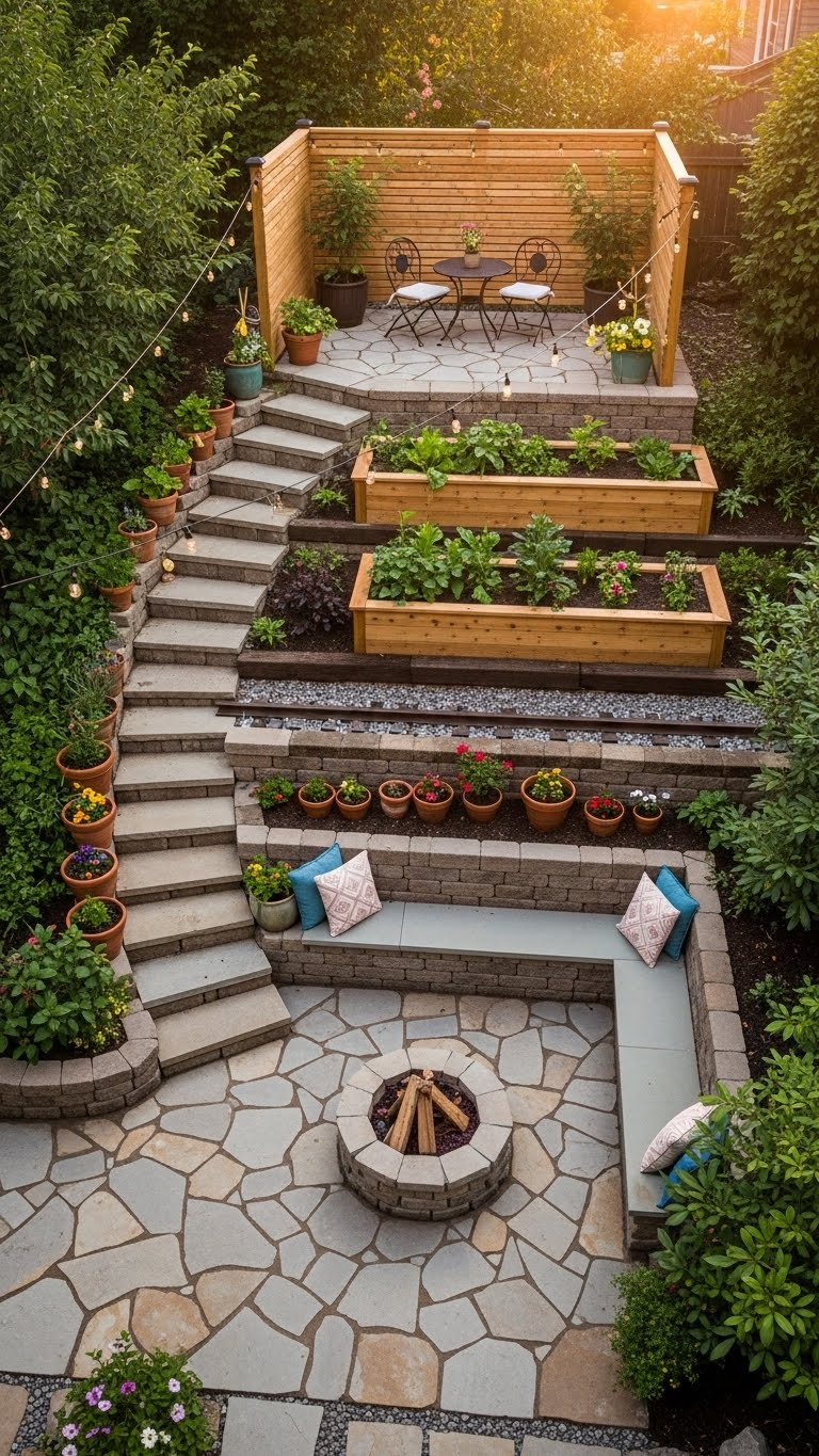 Innovative three-tiered patio garden built into a sloped backyard with flagstone seating, raised planter beds, and meditation space (AI modified)