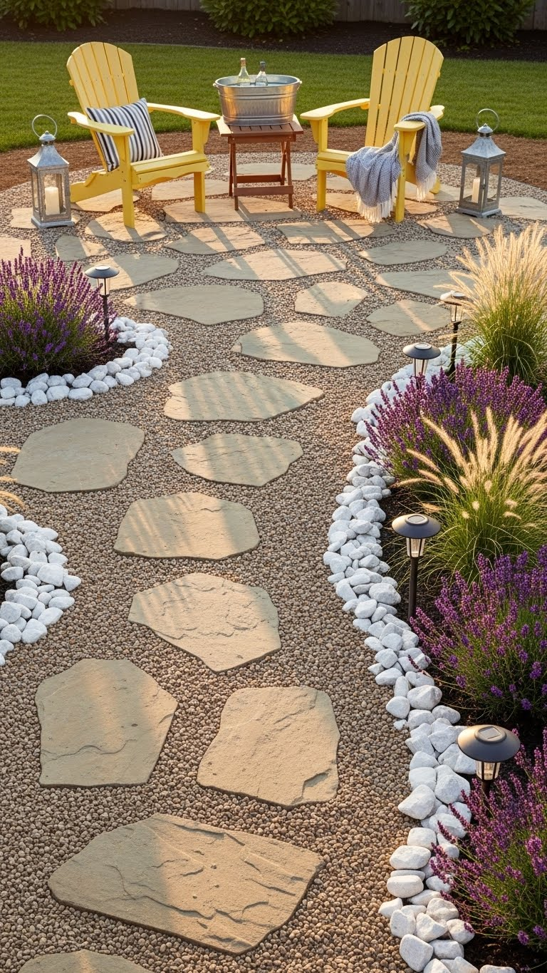 Paint DIY Adirondack chairs in cheerful yellow to flank a small wooden side table, creating a sunny focal point against the neutral gravel. Border the entire space with white landscaping rocks for clean definition, and plant clusters of lavender and ornamental grasses between stones for softness and fragrance. Add solar stake lights along the perimeter and vintage-inspired metal lanterns for evening ambiance. A galvanized metal tub serves double duty as an ice bucket during parties or a planter during quiet seasons. This layout for small yard patios proves that backyard patio designs for small spaces can look professionally landscaped even on a shoestring budget.
