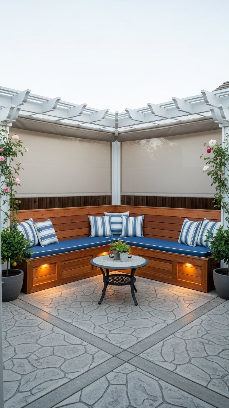 Space-efficient corner patio with L-shaped cedar built-in bench, white pergola with retractable canopy, and storage underneath (AI modified)