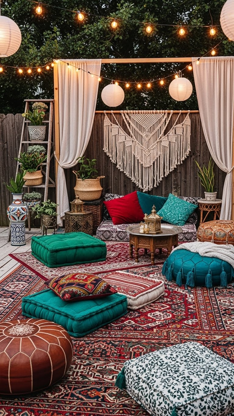 Layer personality with textiles and color to create an 8×12-foot bohemian paradise. Stack outdoor rugs in vibrant Persian and kilim patterns on your base surface, then scatter oversized floor cushions and poufs in jewel tones of emerald, ruby, and sapphire around a low Moroccan tea table. Hang a statement macrame wall hanging on your fence as a textured backdrop, and drape flowing sheer curtains from a simple wooden frame for privacy and romance.