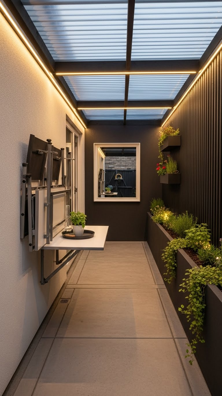 Creative narrow side yard patio with wall-mounted folding furniture, vertical slat privacy screen, and overhead pergola with translucent panels (AI modified)