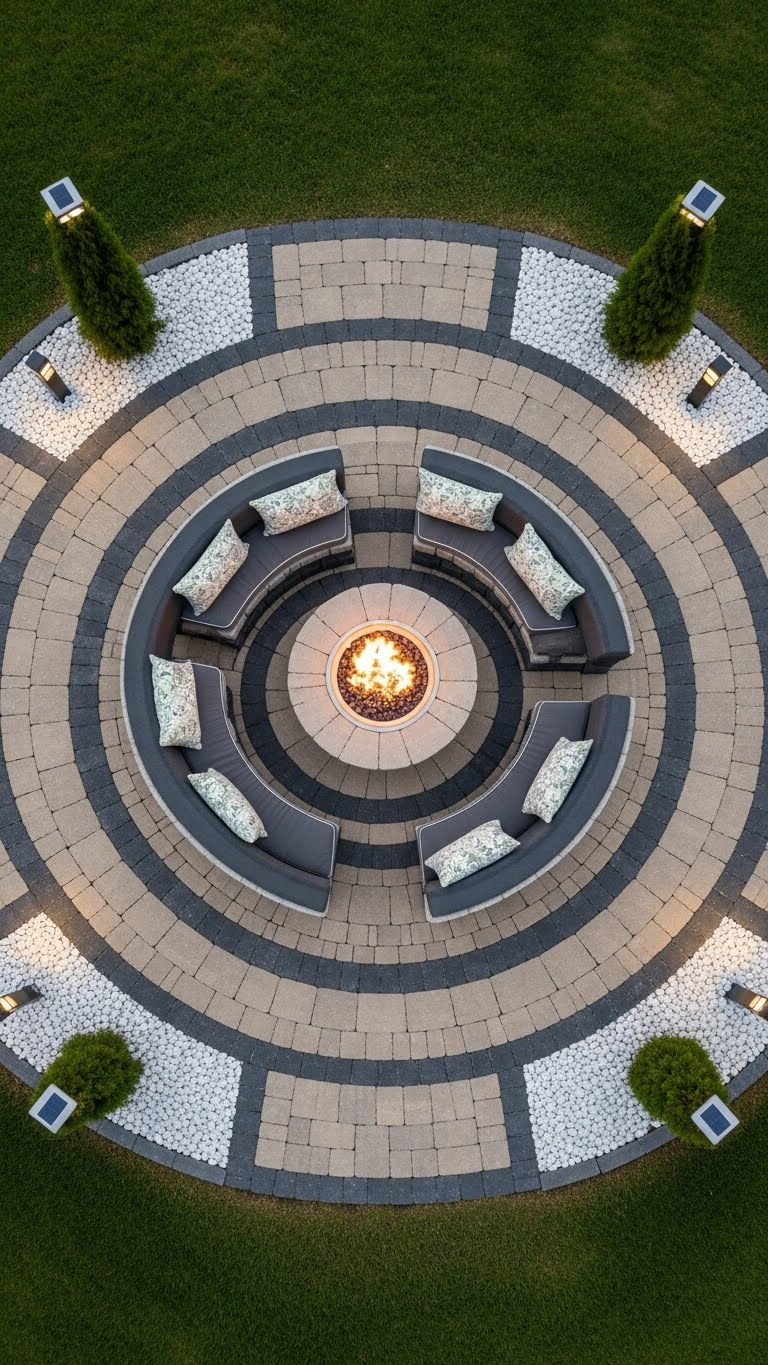 Distinctive circular patio featuring concentric rings of pavers in tan and charcoal creating a medallion pattern around a central fire pit (AI modified)
