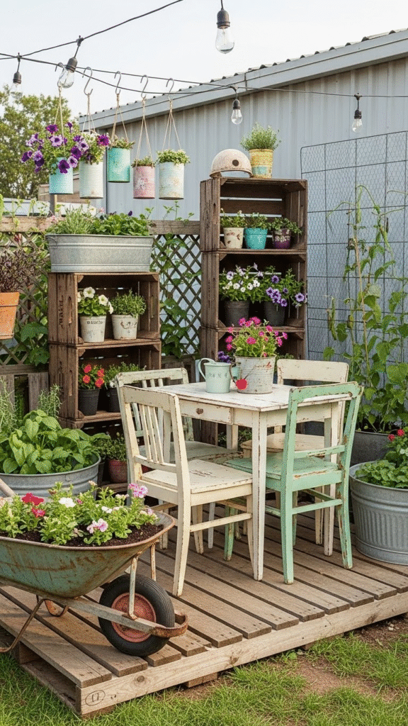 Charming patio with creative container gardening using repurposed wooden crates, vintage washtubs, painted tin cans, and a weathered wheelbarrow (AI modified)