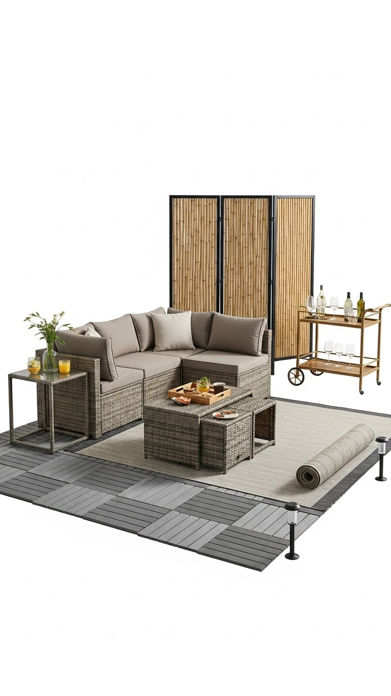Versatile patio with modular outdoor sectional in taupe, interlocking foam tiles, rolling bar cart, and folding bamboo privacy screen (AI modified)