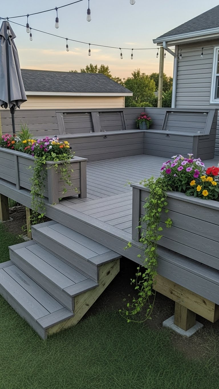 Low raised deck platform in driftwood gray with integrated planter boxes, built-in bench with storage, and wide steps (AI modified)