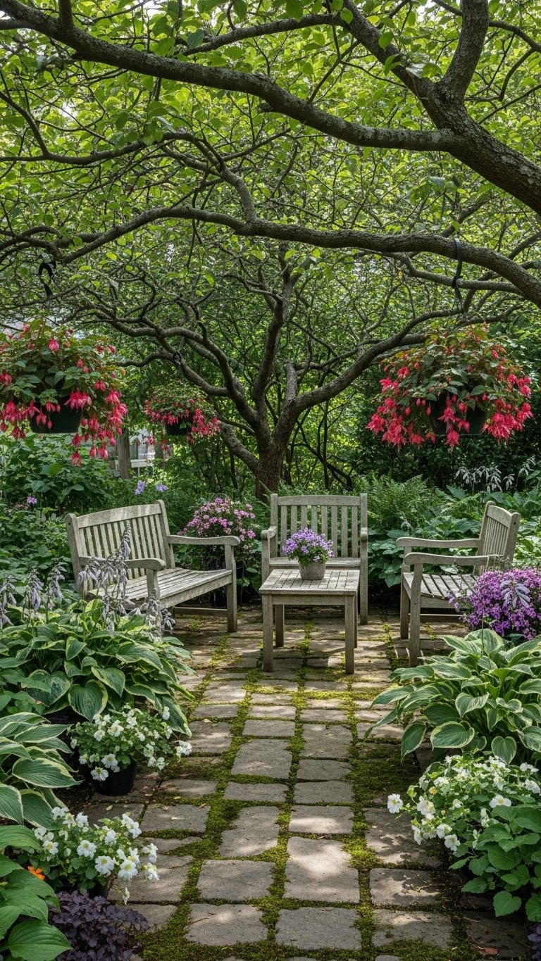 Serene patio nestled under mature tree canopy with shade-tolerant hostas and ferns, permeable pavers, and silver-gray teak furniture (AI modified)
