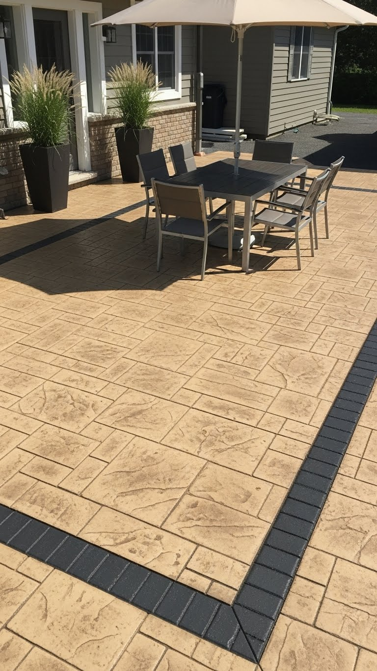 Professional stamped concrete patio in warm sandstone with charcoal border, featuring ashlar slate pattern and modern aluminum dining set (AI modified)