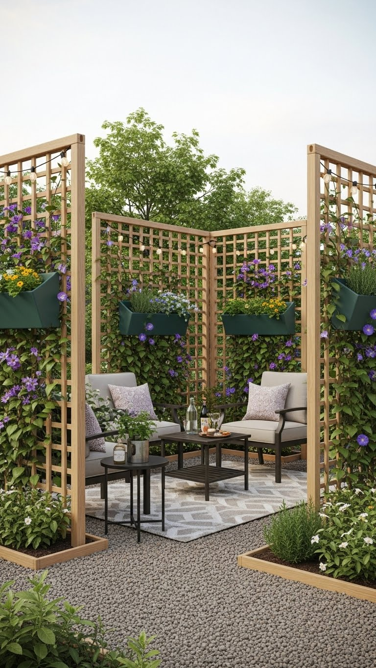 Intimate patio with freestanding wooden lattice trellis panels covered in blooming clematis and morning glories creating living privacy walls (AI modified)