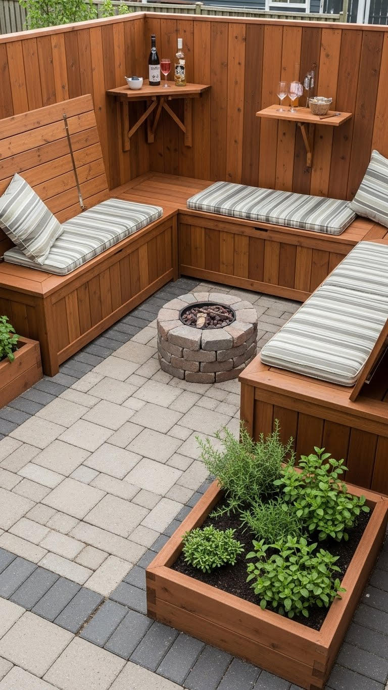 Every element should work double-duty in tight quarters where wasted space isn’t an option. Build storage benches from cedar fence boards with hinged lids that reveal ample storage for cushions, garden tools, outdoor toys, and seasonal decorations. Arrange three benches in a U-shape to create natural conversation seating around a central area perfect for a small fire pit or coffee table, maximizing your 9×12-foot footprint.