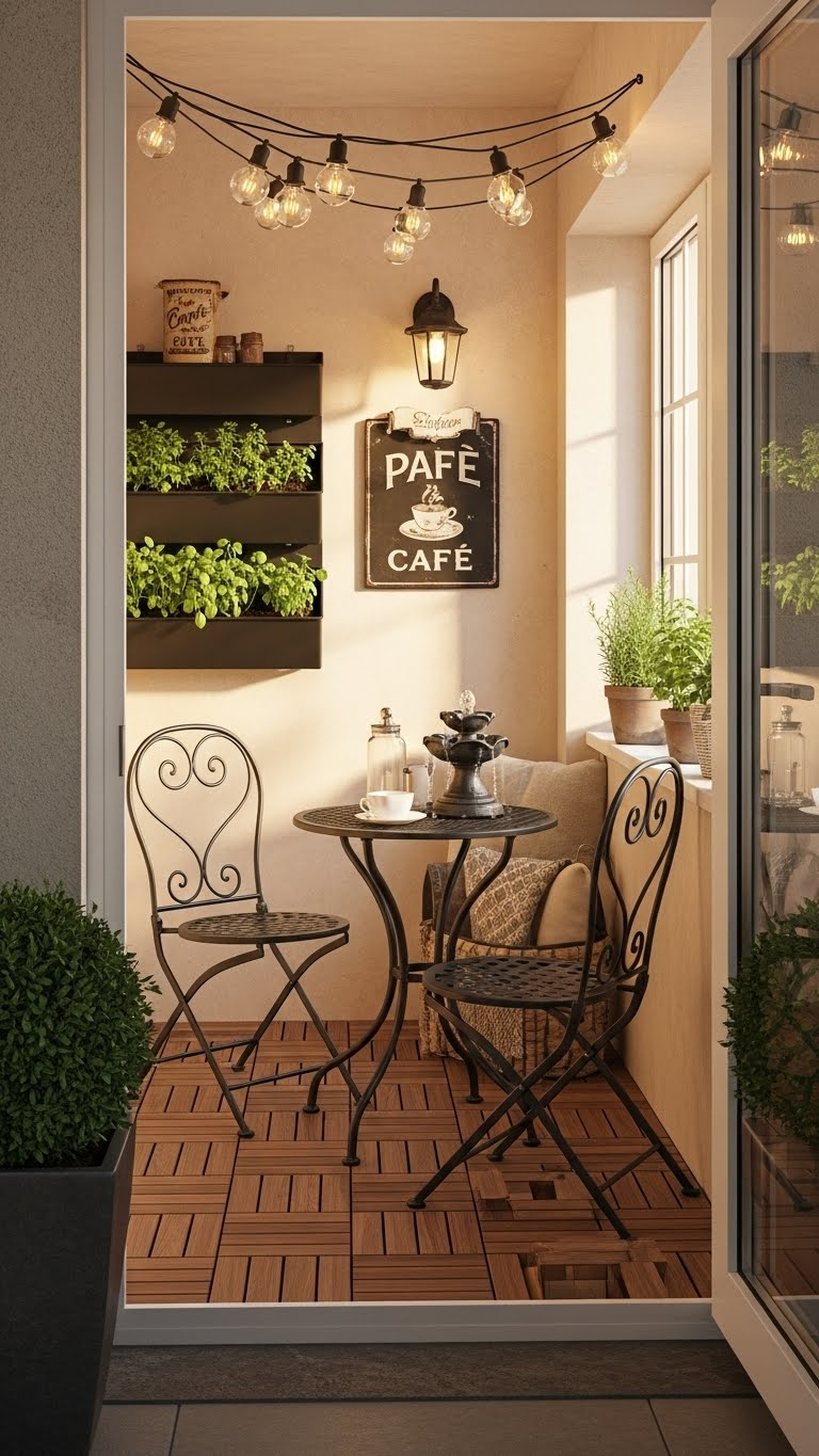 Charming micro-patio with ornate black metal folding bistro set, vertical herb planter, Edison bulbs, and European cafe ambiance (AI modified)