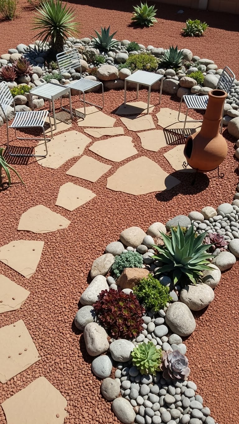 Desert-inspired patio with terracotta decomposed granite, flat stepping stones, decorative river rocks, and drought-tolerant succulents (AI modified)
