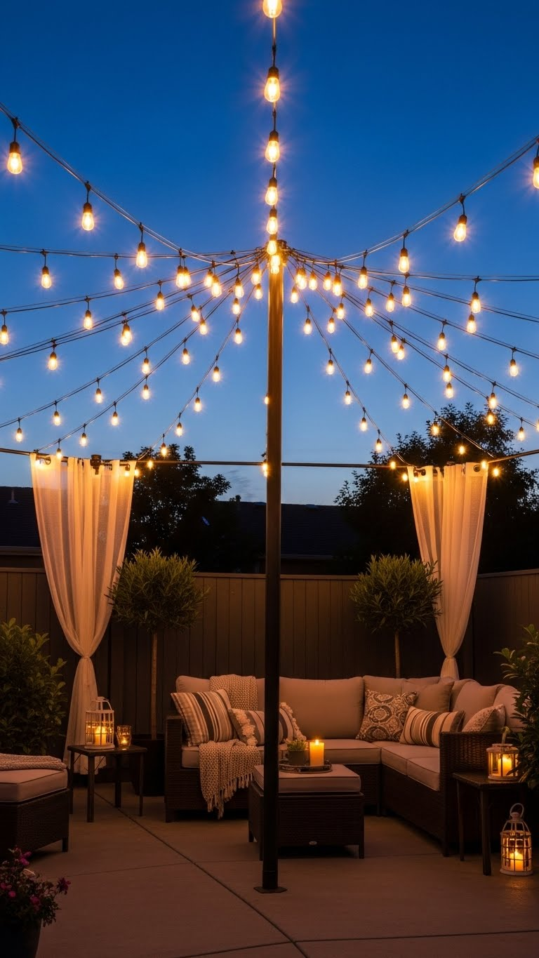 Arrange a comfortable outdoor sectional with plush cushions and throw pillows underneath your light canopy, and hang sheer outdoor curtains on two sides that billow gently in the breeze for softness and romance. Surround the 10×12-foot space with potted trees and plants that create a green perimeter, and add small side tables holding candle lanterns for extra sparkle at ground level. This budget DIY approach to small backyard patio designs delivers Pinterest-perfect results that look far more expensive than they actually cost. The layout for small yard patios becomes almost irrelevant when lighting creates this much atmosphere and enchantment—everyone will want to spend time in your transformed space that feels like a completely different world as soon as the sun sets and the lights come on.