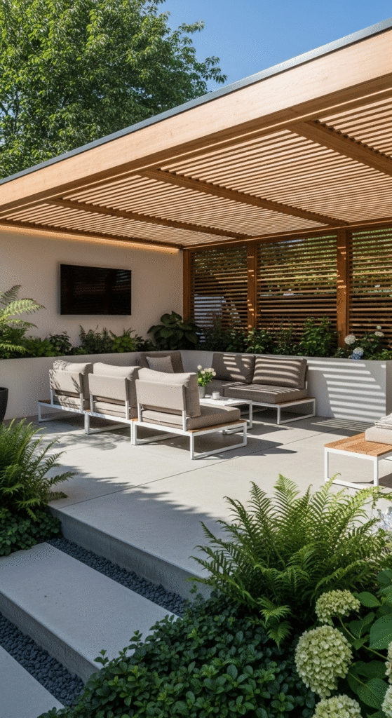 Add a modern fire bowl—something sculptural with clean lines. Modular seating in neutral grays or blacks maintains the contemporary feel. Weave LED rope lighting through the pergola beams for evening illumination.