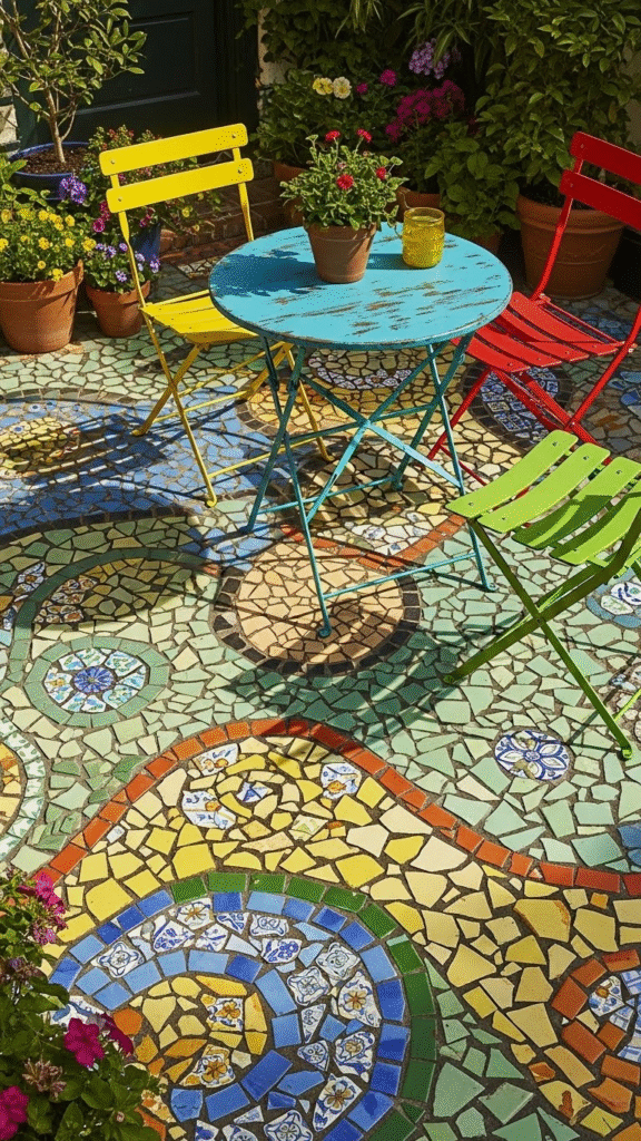A small round table with brightly painted chairs enhances the artistic atmosphere. Choose furniture colors that complement your tile palette. This budget backyard patio design creates a focal point that becomes a conversation starter and showcases your creativity.