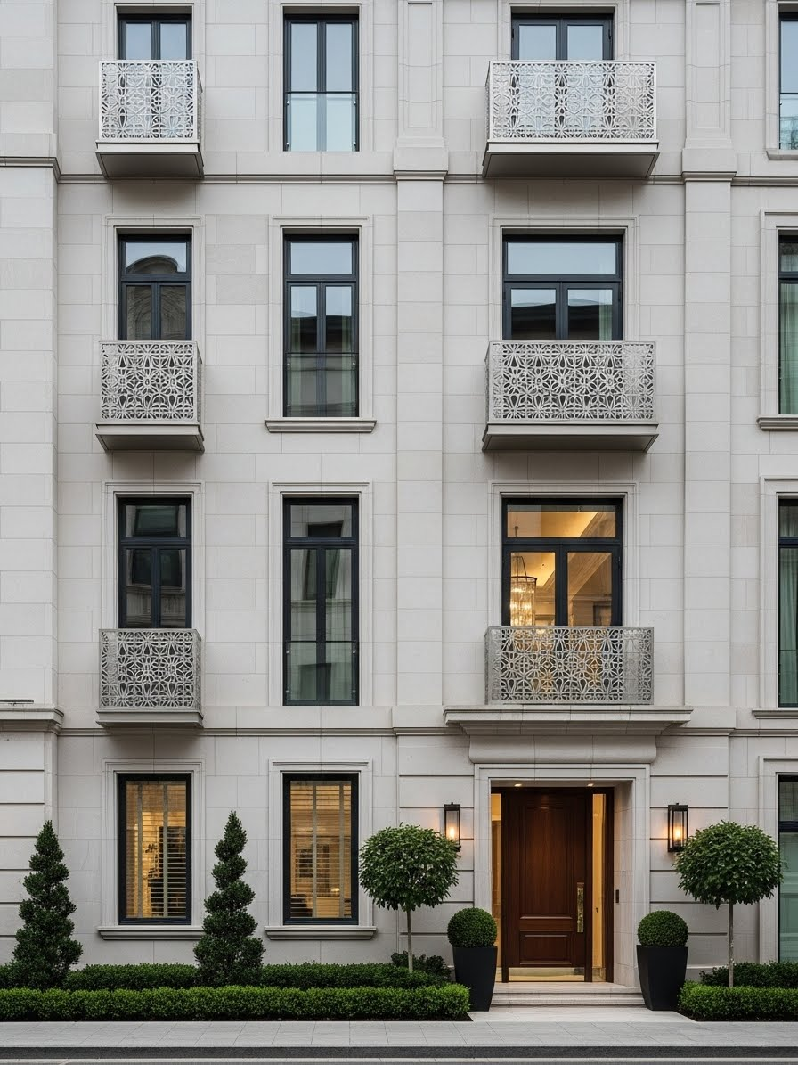Limestone cladding signals permanence and quality—this sedimentary stone has been used in prestigious architecture for millennia because it ages gracefully and conveys substance. The intricate laser-cut metal privacy screens on the balconies provide contemporary counterpoint, their delicate patterns contrasting with the limestone’s solid mass. These screens serve practical purposes—privacy from neighbors, sun shading, safety railings—while adding visual richness through pattern and shadow.