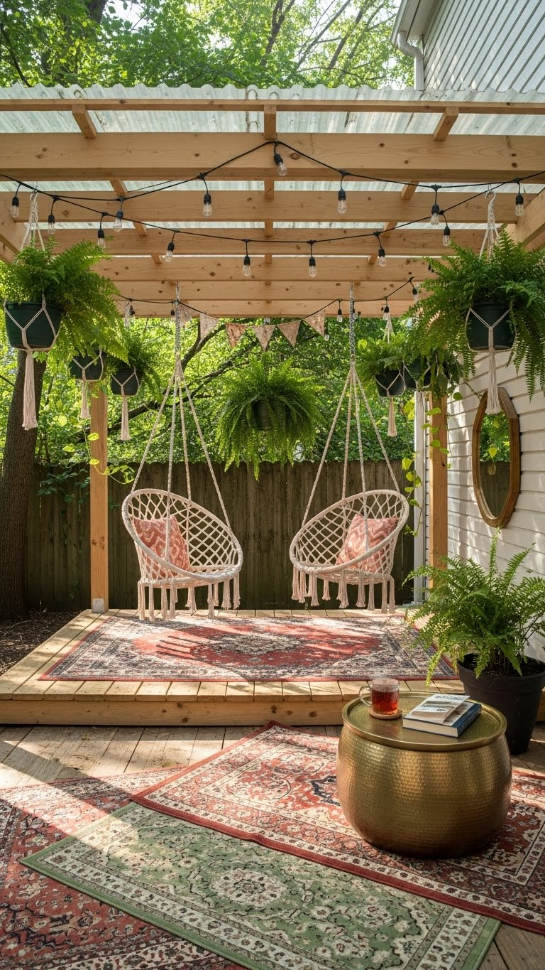 The key to this bohemian luxe look is going vertical. Hang two macramé egg chairs from sturdy pergola beams—they’re both functional seating and decorative elements. Create a “living ceiling” by suspending hanging planters filled with trailing pothos and ferns. The greenery softens the space and adds natural texture overhead.