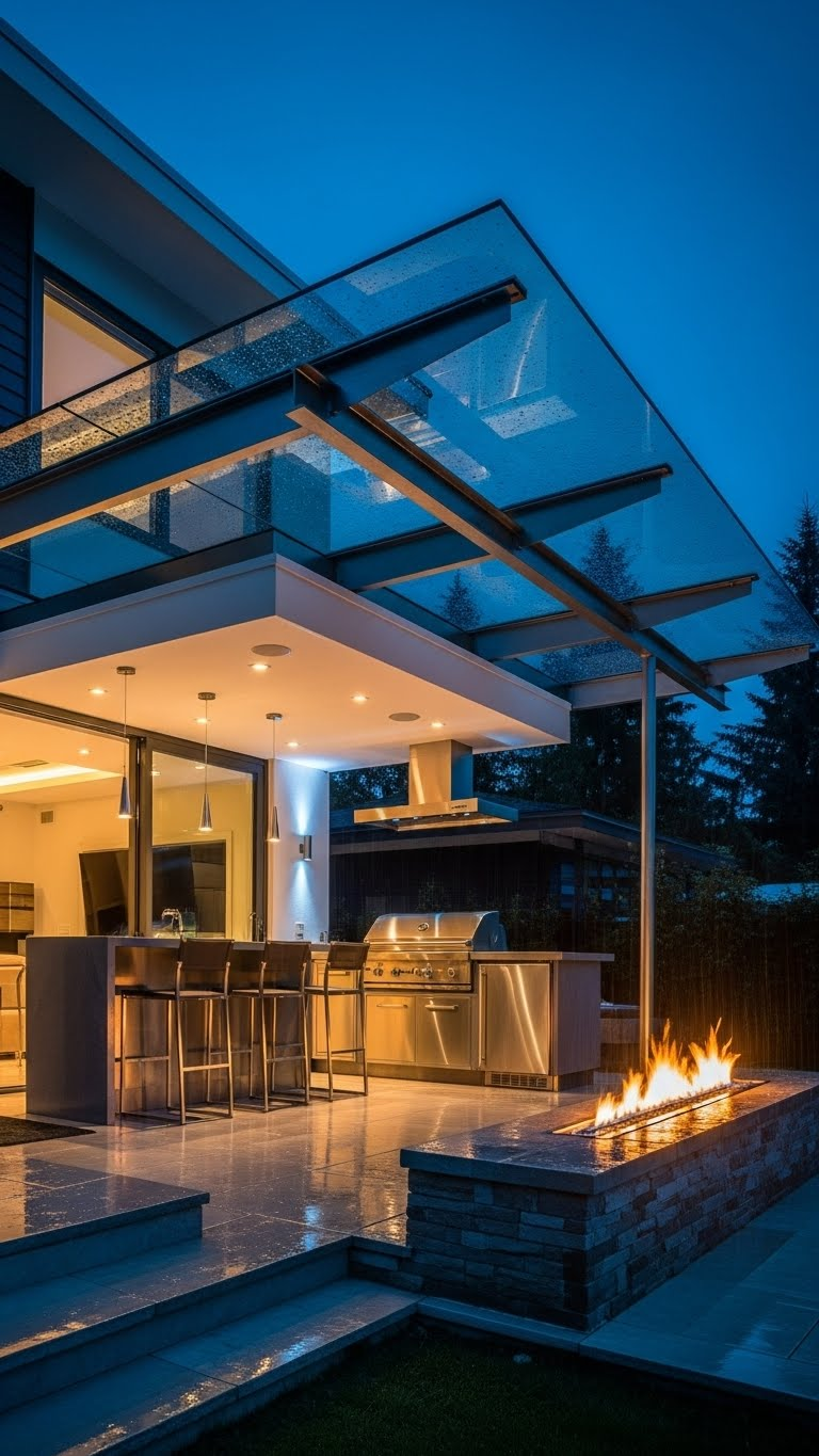 This design truly shines during rain—you stay completely dry while watching water drops create patterns on the glass overhead. Under this protection, install a sleek outdoor kitchen with stainless steel appliances and a bar counter for entertaining. The reflective surfaces and ultra-clean lines create a sophisticated backdrop for gatherings.