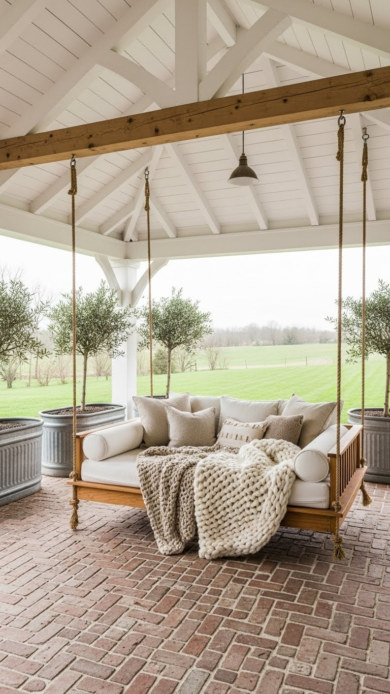 Flank your swing with large galvanized metal planters containing olive trees. These add height and greenery without blocking sight lines to your lawn beyond. This covered deck design is all about creating a space so inviting that you’ll spend entire afternoons reading, napping, or simply swinging gently. Soft, overcast daylight actually enhances the cozy atmosphere rather than detracting from it.