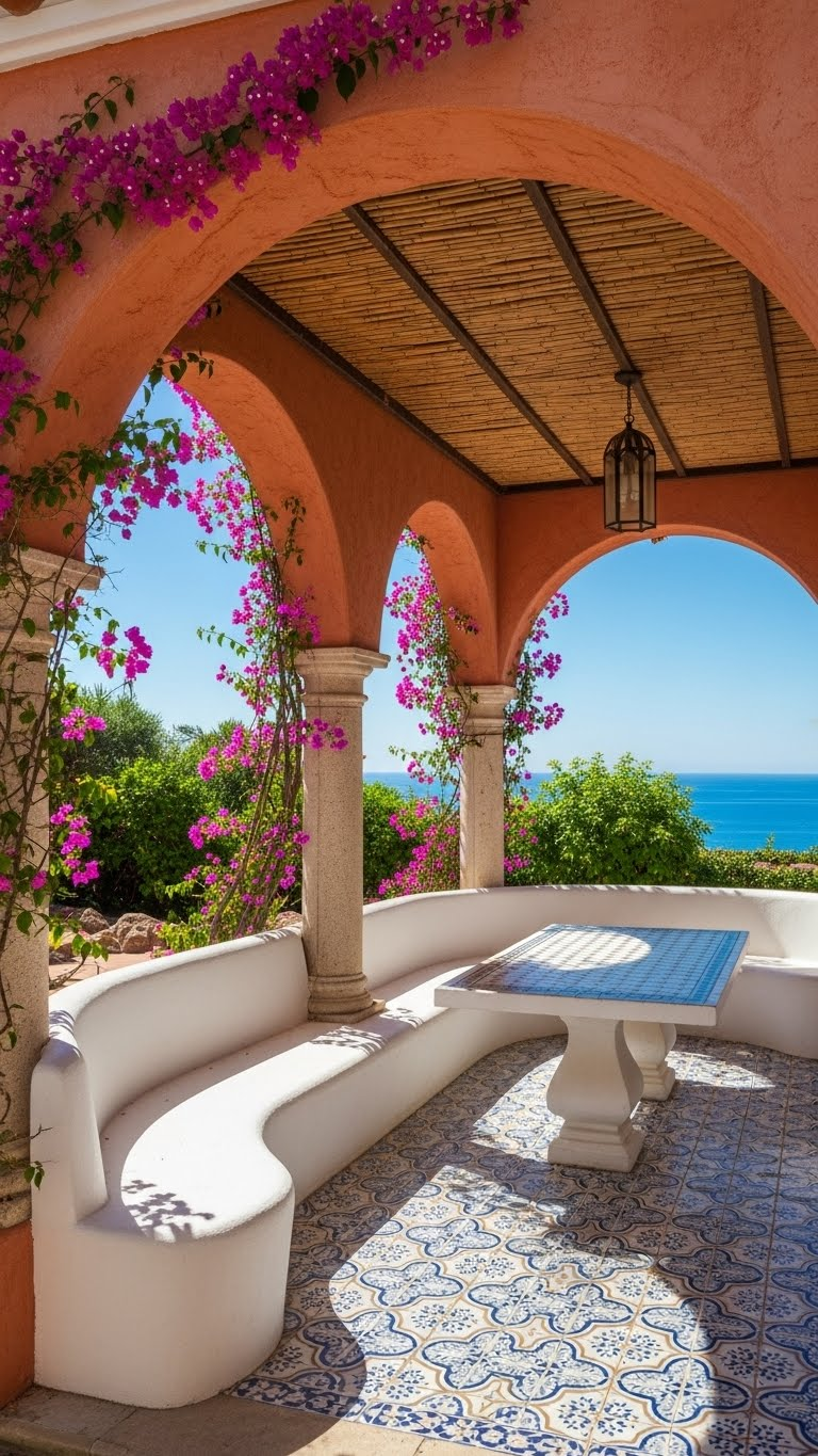 Build white stucco bench seating that curves organically around a mosaic tile table—perfect for leisurely meals that stretch into evening. Plant bougainvillea vines at the base of your arches and train them to climb up and over the structure. The bright magenta flowers against terra cotta walls create stunning color contrast. This covered back patio works especially well if you have even a glimpse of water view in the background, but the design is strong enough to stand alone.