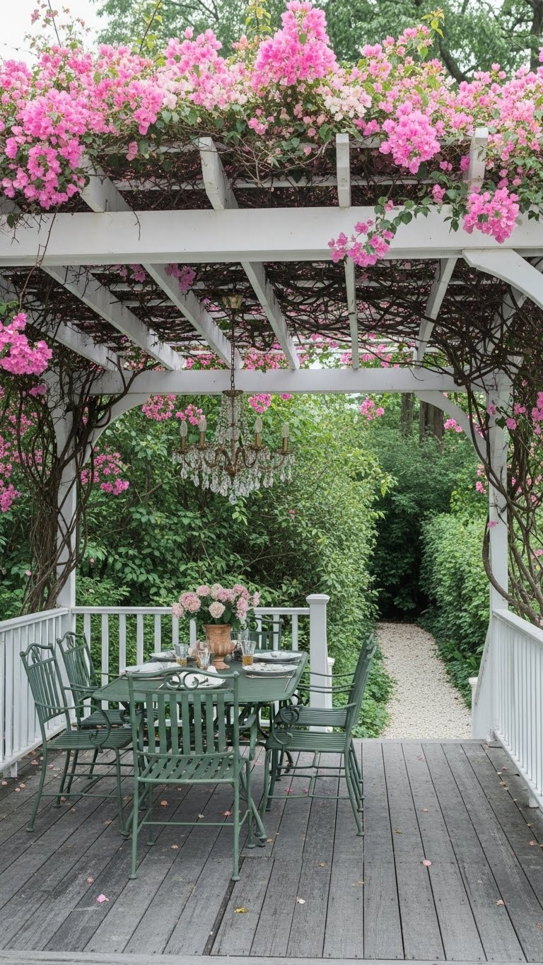 This covered deck design is for gardening enthusiasts and romantics who want their outdoor space to feel like a hidden retreat. Start with a white wooden pergola, but here’s the twist—don’t keep it pristine. Let blooming pink bougainvillea completely overtake the structure, creating a natural floral roof that provides dappled shade and incredible fragrance.