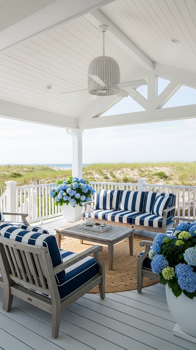Fill large white planters with abundant hydrangeas—their big, fluffy blooms are synonymous with coastal gardens. If you’re lucky enough to have beach or water views, position seating to take advantage, but even without those, the bright, high-key lighting and breezy color scheme create a vacation atmosphere. This covered back patio feels fresh and relaxed, perfect for morning coffee or sunset cocktails.