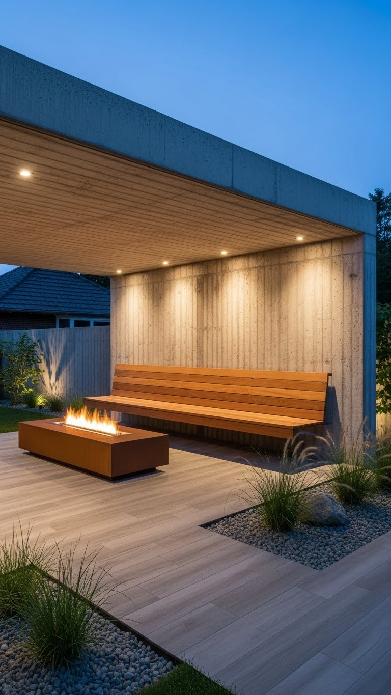 Center a sleek, rectangular fire table made from corten steel—this weathering steel develops a rust patina that’s actually protective and looks incredible against concrete. Keep landscaping minimalist with architectural grasses and river stones rather than traditional flowering plants. Light dramatically at twilight with recessed LEDs that graze the concrete walls, highlighting every texture. This backyard covered patio design with fire pit is sophisticated and timeless.