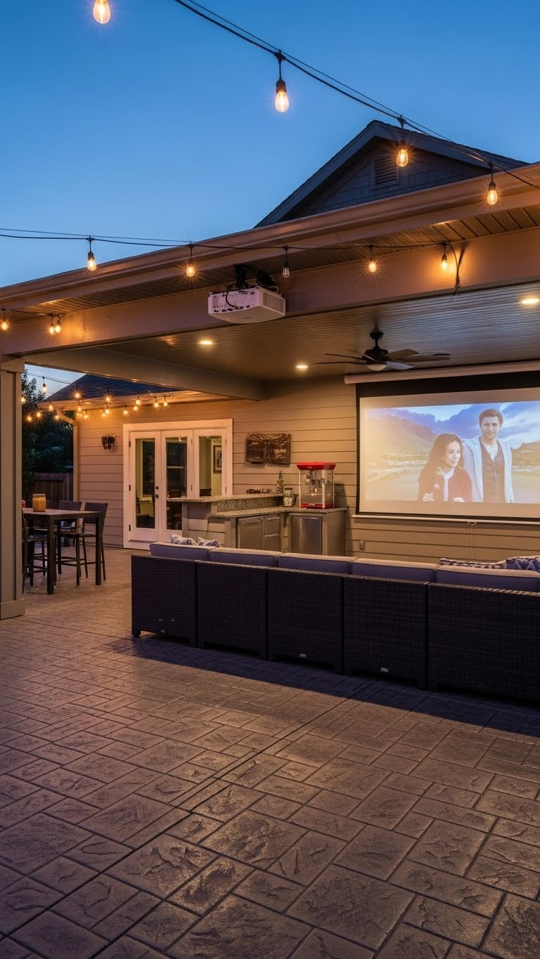 This backyard patio design partially covered creates distinct zones for different activities, perfect for families and entertainers. Under the covered section, focus on viewing: install a deep, comfortable sectional sofa facing a large retractable projector screen. Add a built-in bar fridge and even a popcorn machine for authentic movie night vibes.