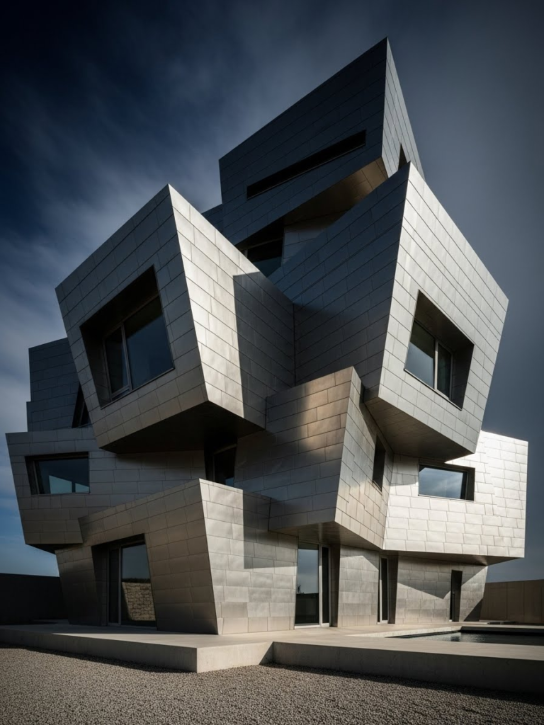 Fragmented planes and tilted walls reject traditional architectural symmetry, creating a composition that appears to be in motion or mid-transformation. Titanium panels clad these intersecting surfaces, their metallic finish reflecting light at varying angles depending on each plane’s orientation. This deconstructivist approach—an architectural philosophy that fragments and destabilizes conventional building forms—challenges expectations of what residential architecture should look like.