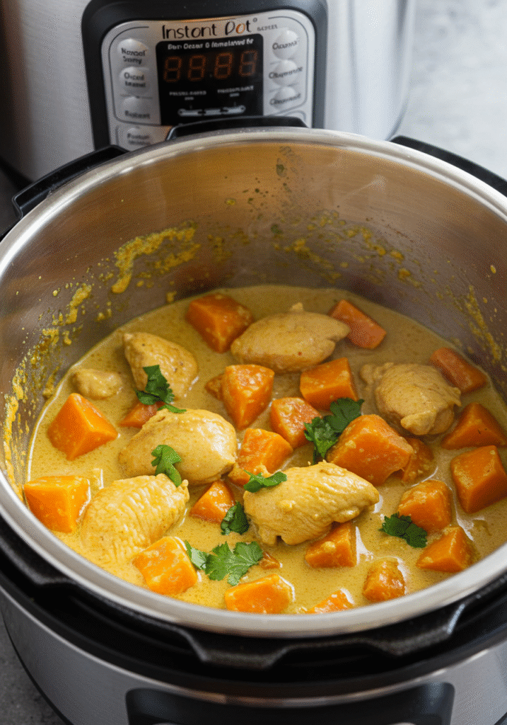 4. Pour in broth, cover, and simmer 15 minutes until sweet potatoes are tender.