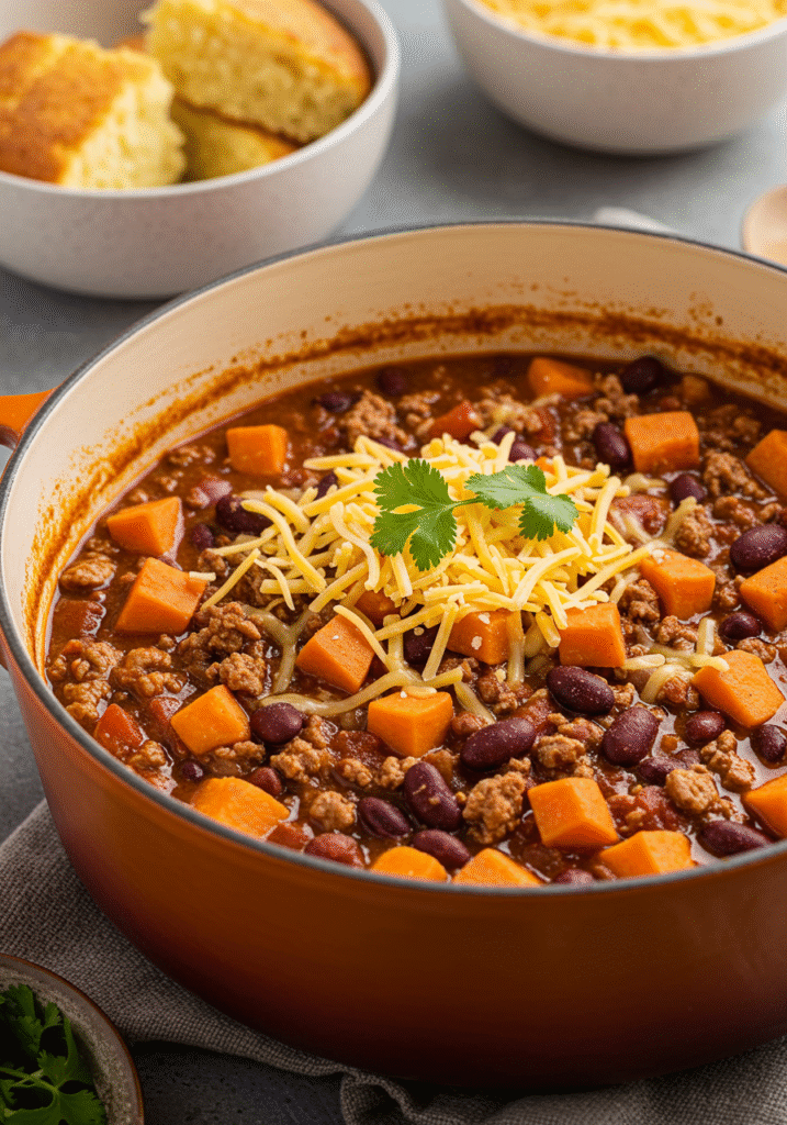 Hearty chili with ground turkey, sweet potato chunks, beans, and warming spices. High protein and perfect for meal prep.