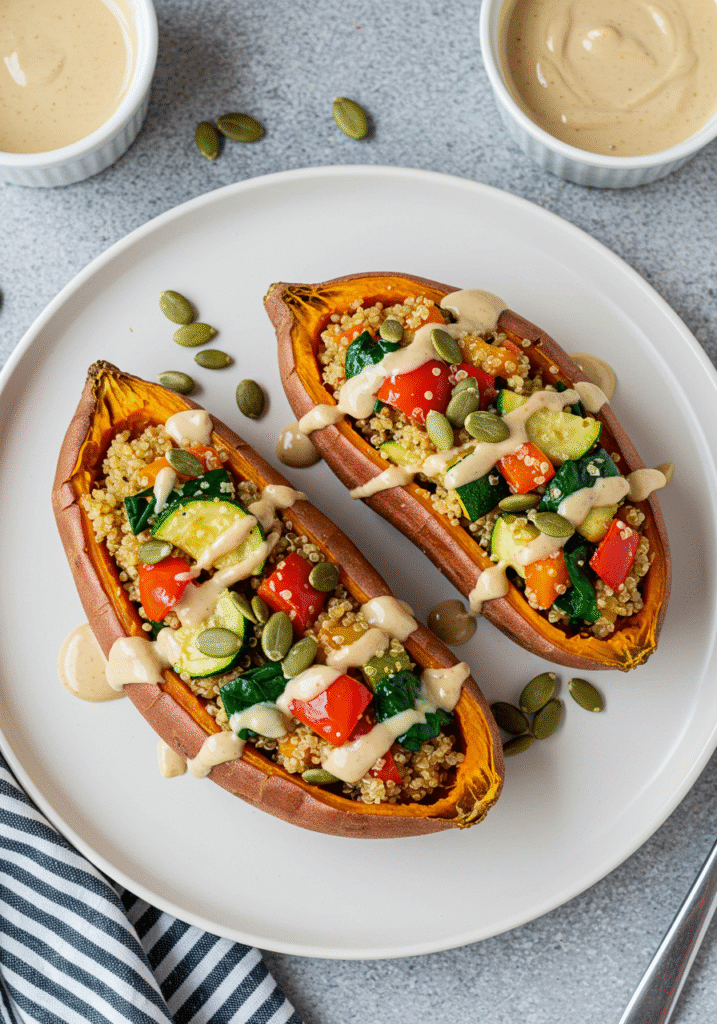 Healthy vegan stuffed sweet potatoes loaded with quinoa, sautéed vegetables, and tahini drizzle.
