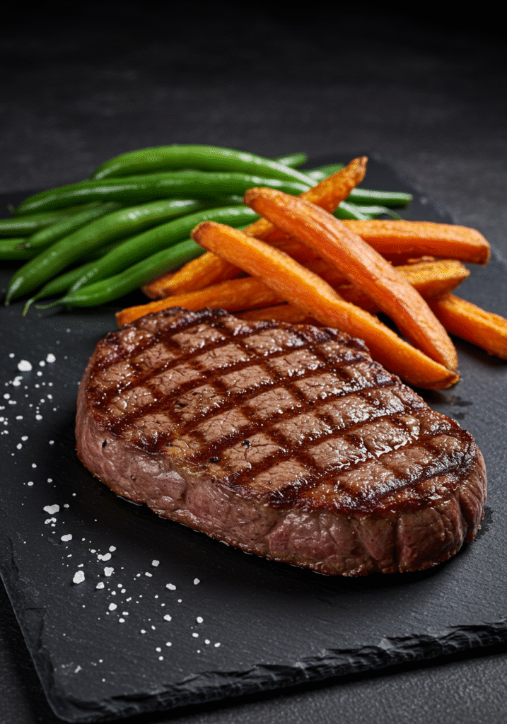 Classic steakhouse dinner at home with juicy steak, crispy sweet potato fries, and fresh green beans.