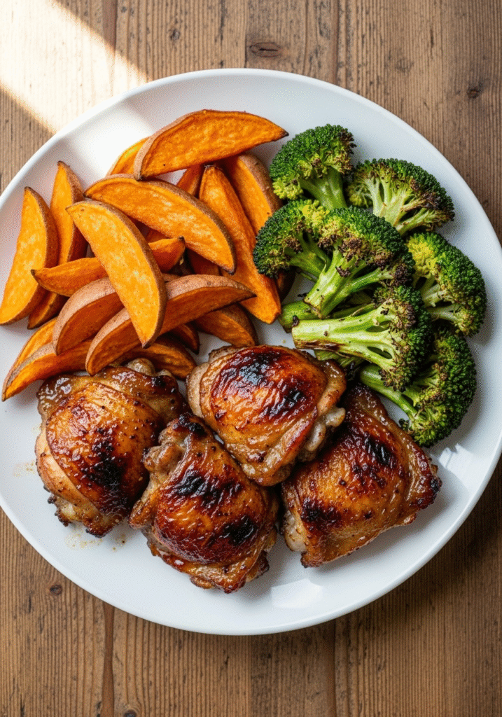 Sticky glazed chicken paired with crispy oven-roasted sweet potato wedges and tender broccoli. A complete, satisfying meal ready in under an hour.